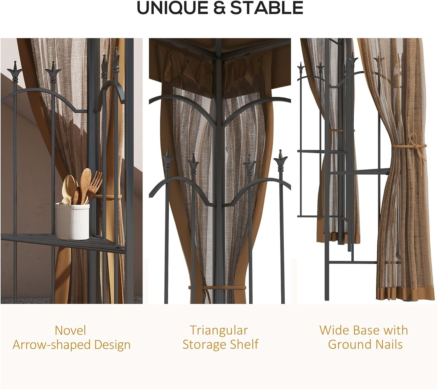 Outdoor Gazebo – Decorative and Spacious: This patio gazebo tent offers ample space for gatherings without feeling crowded. Its reinforced garden-gate-style corners provide both stability and elegance, while the arrow-tip motifs add a decorative touch suitable for weddings and formal events.