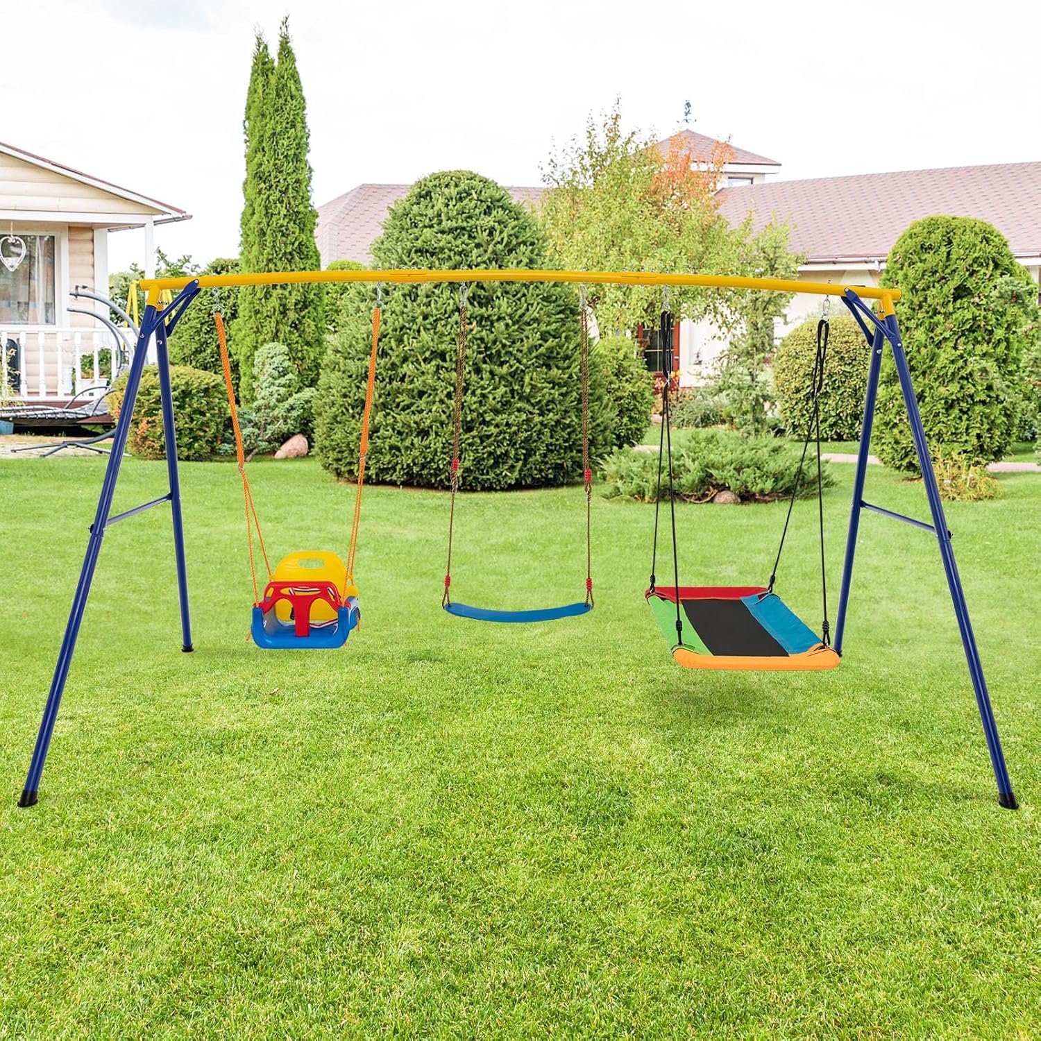 Durability and safety are guaranteed by the premium construction. The frame is made from rust-proof carbon steel with a powder-coated finish, ensuring excellent weather resistance. Stability is enhanced by the reliable A-shaped frame, metal gaskets, and reinforced crossbars. The large platform swing features foam-covered metal pipes to prevent scratching delicate skin, and the tear-resistant oxford fabric and high-quality EVA add longevity and comfort to the swings.